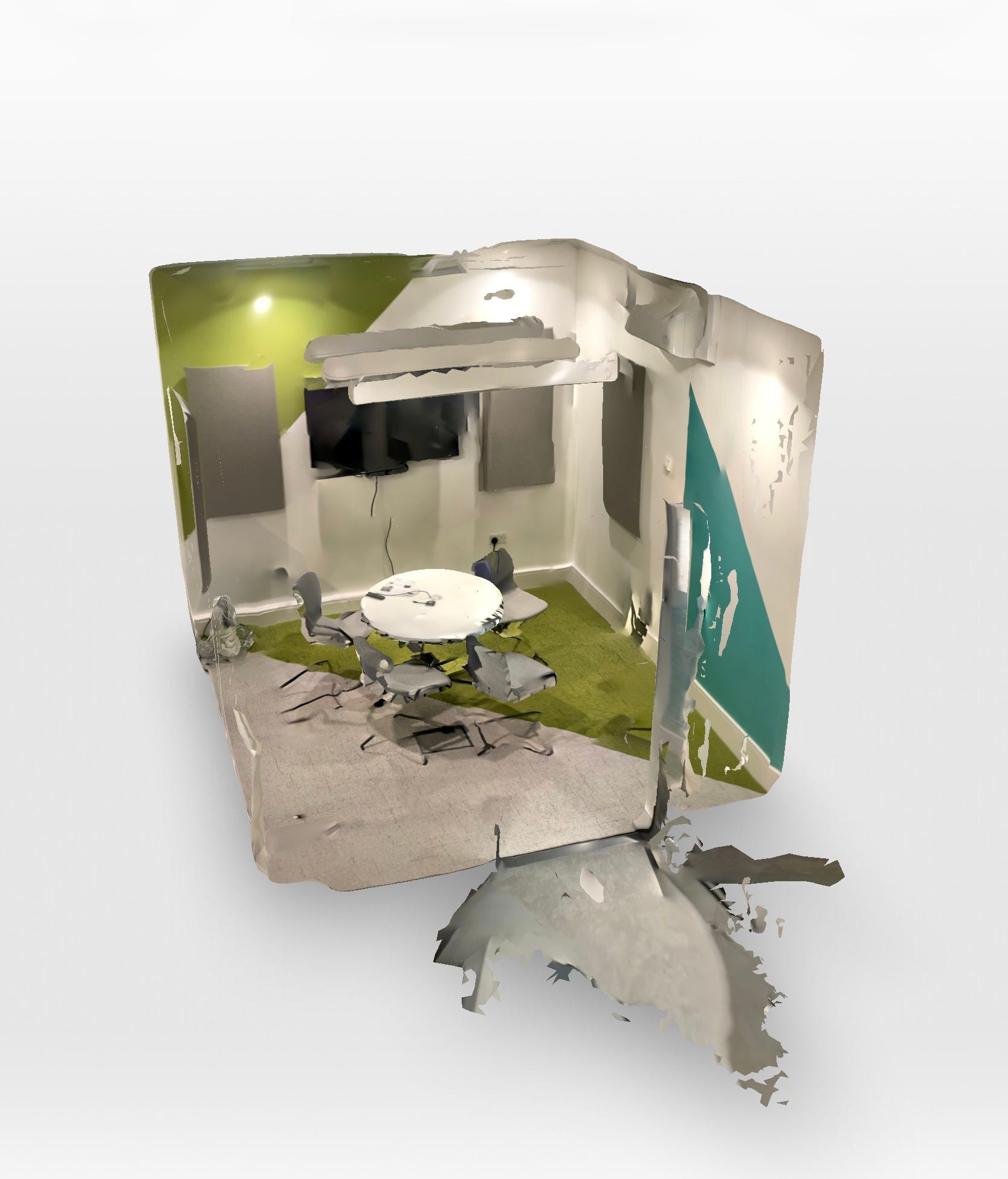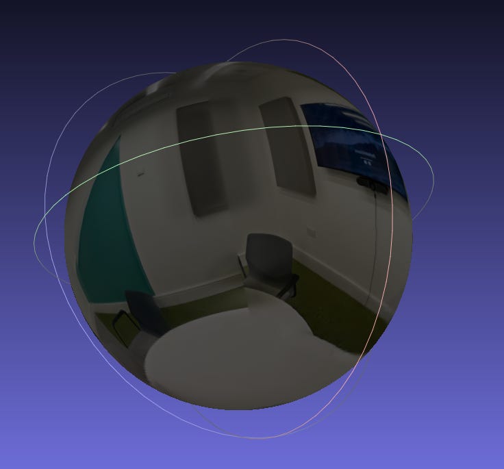 360 with AI autofill: This involves taking a 360 panoramic scan of the room, and then AI is used to fill in the top and bottom of the scan. This isn’t great and interpreted the white table in our meeting room as a white void. When you export this as an OBJ, it exports as a sphere.