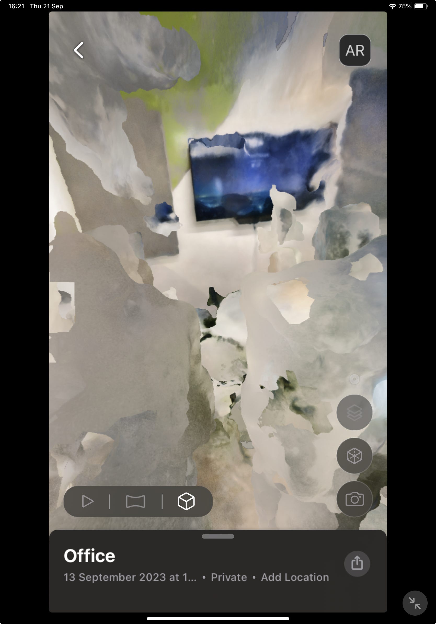 If you don’t have a LiDAR scanner, NERF is an AI model that allows you to combine images of a room and convert them into a mesh. Luma is a free app that allows you to do this using your mobile or tablet. On their website, they have lots of great examples of the 3D models created using their app. Here is a scan I made using the Luma app on the iPad, but be warned, it looks like it came straight from a horror movie set.